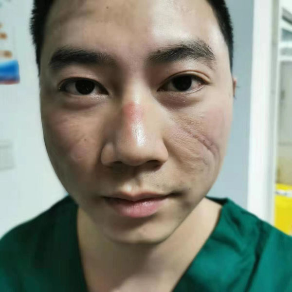 Marks are seen on a doctor's face after removing masks and goggles he wore for 6 hours in Wuhan, Central China’s Hubei province. [Photo provided to chinadaily.com.cn]