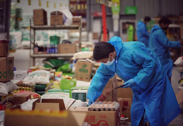 Liu Lang, a deliveryman for Meicai.com, an online grocery store, picks up food for customers on Feb 21, 2020. CHEN LIANG/FOR CHINA DAILY