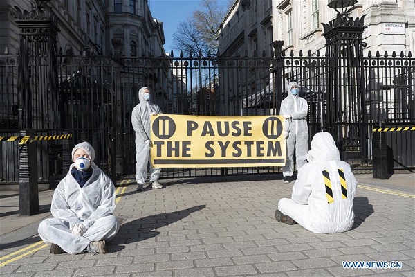 Activists stage a protest outside 10 Downing Street against the British government's handling of the COVID-19 outbreak in London, Britain on March 16, 2020. [Photo/Xinhua]