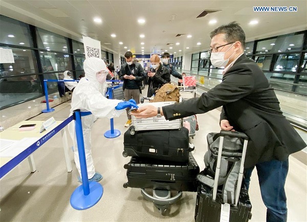 A staff member checks the information of a passenger entering China at the Pudong International Airport in Shanghai, March 19, 2020. [Photo/Xinhua]